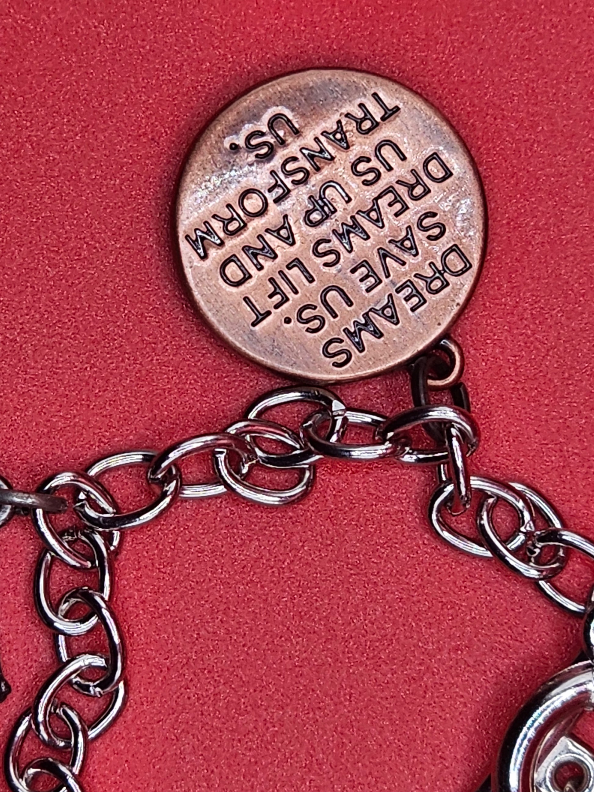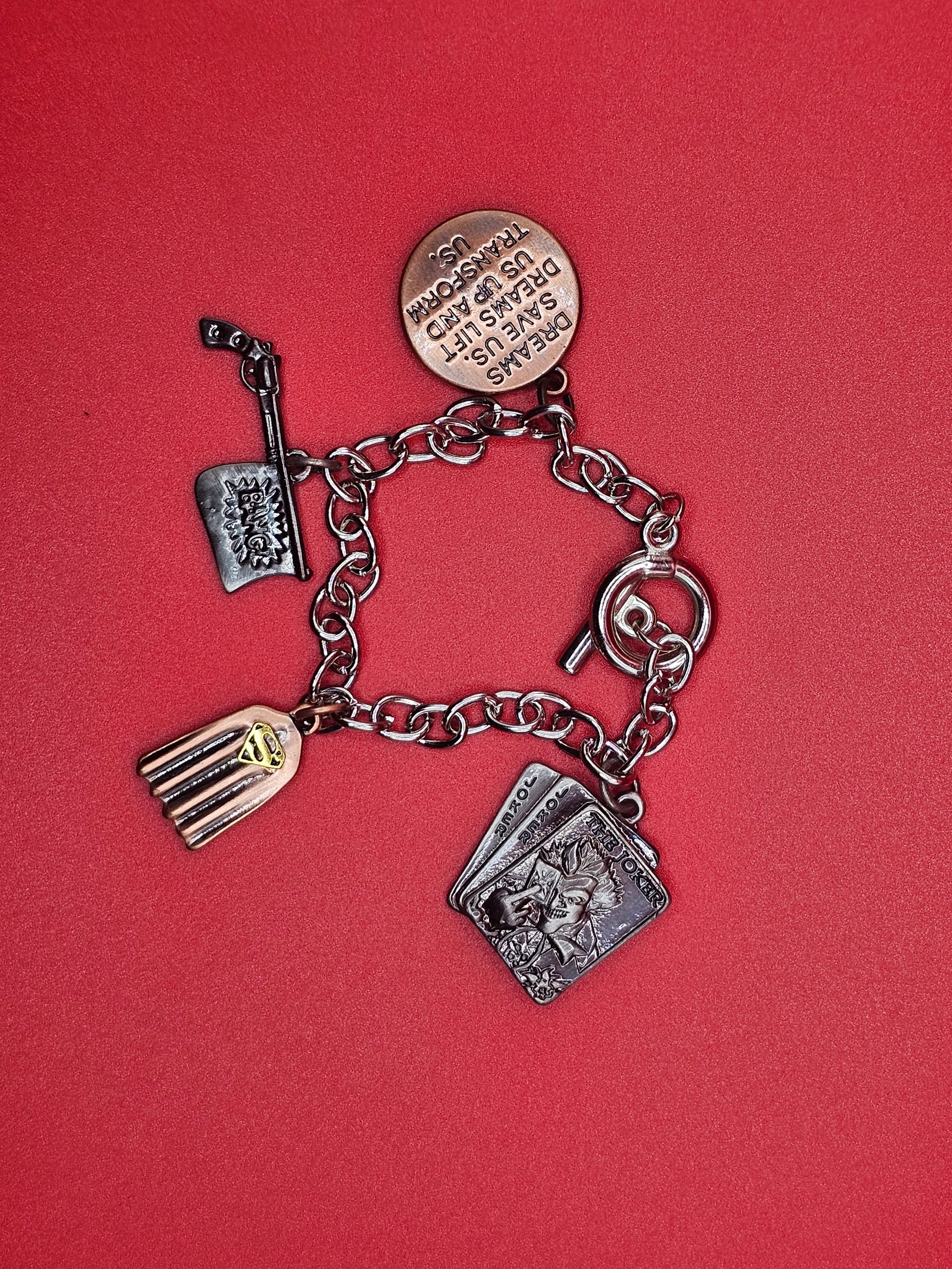 This DC themed metal bracelet includes 4 modern art charm pieces, providing a unique and stylish addition to any outfit. Made of high-quality metal, it showcases your DC fandom while adding an edgy touch. Elevate your accessory game with this expertly crafted piece.